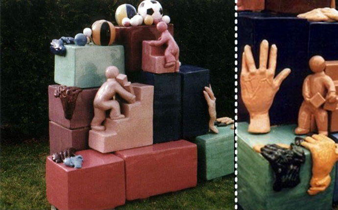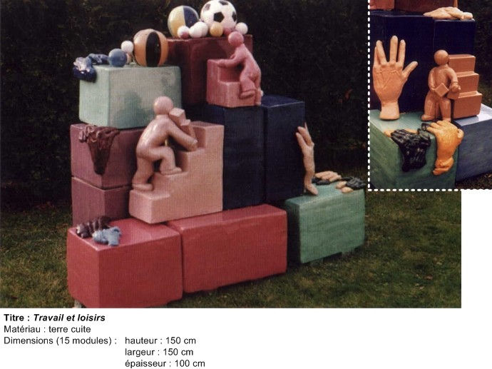 Symbolique : Sur des cubes et rectangles sont “cuits” diverses mains. la plus grosse main représente le dirigeant d’une communauté. Un ouvrier transporte un madrier. Un enfant et son cube est en position ascensionnelle. Adultes et enfants construisent le présent et le futur. Au sommet, divers ballons sont aussi cuits dans les rectangles. Ils sont le symbole des loisirs nécessaires à tout citoyen.